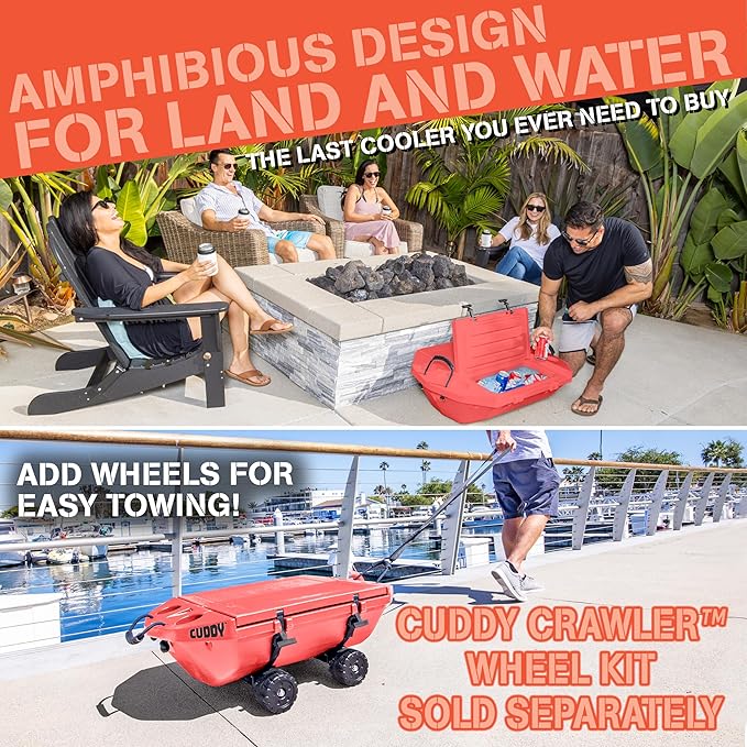 - AMPHIBIOUS FLOATING COOLER: Float, tow or anchor, the CUDDY is a purpose built floating cooler and dry storage vessel that also serves as a traditional cooler on land; Always have your drinks or gear within reach while on the water