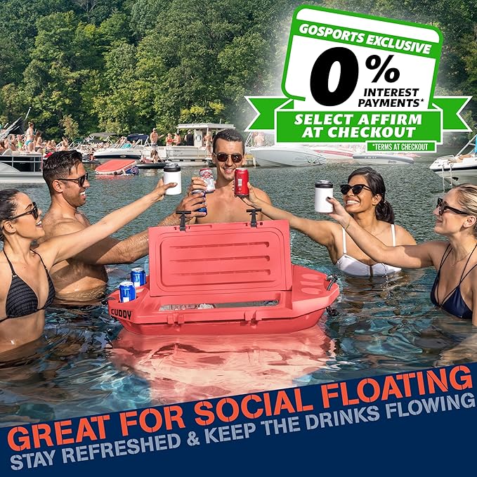 - SOCIAL FLOATING: Always have your cold drinks within reach, in and out of the water; Easy cooler access for 2 large lids and 4 built in cup holders; Anchor your CUDDY on the sandbar, tie-off on your boat or tow behind your kayak