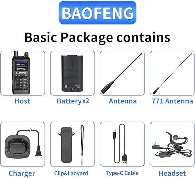 - Included Components : 1XType-C Charging Cable & US Base Charger& Manual, 1XHeadset& Belt& Sling, 1XRadio, 1XAR-771, 2XBatteries 1XType-C Charging Cable & US Base Charger& Manual, 1XHeadset& Belt& Sling, 1XRadio, 1XAR-771, 2XBatteries