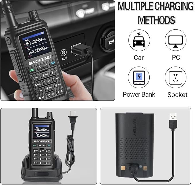 - ✅【Multiple Charging Methods】Each Radio equippend with USB-C Charging Cable+US Base Charger+2500mAh Rechargeable Larger Battery,you can easily charge it from power bank、PC、car、wall、laptop and any usb slot and long standby time.