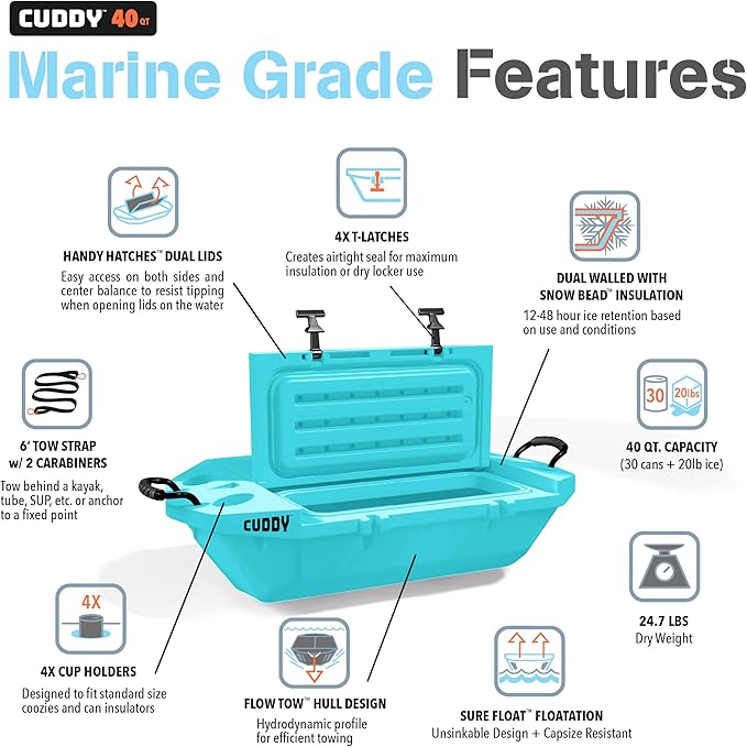 - MARINE GRADE FEATURES: Robust HDPE build, 40 qt capacity, dual walled insulation, dual lids, 4x T-latch handles, hydrodynamic profile, tow / tie-down rope, 4x cup holders; Patent Pending