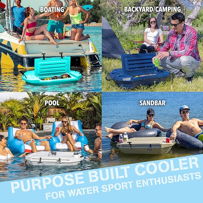 - TAKE IT ANYWHERE: Fully functioning cooler in and out of the water, the CUDDY is a must have for outdoor enthusiasts: boating, kayaking, camping, rafting, tubing, fishing, pools, sandbars or anywhere on land; Easy to tow in water while also providing a stable base on land