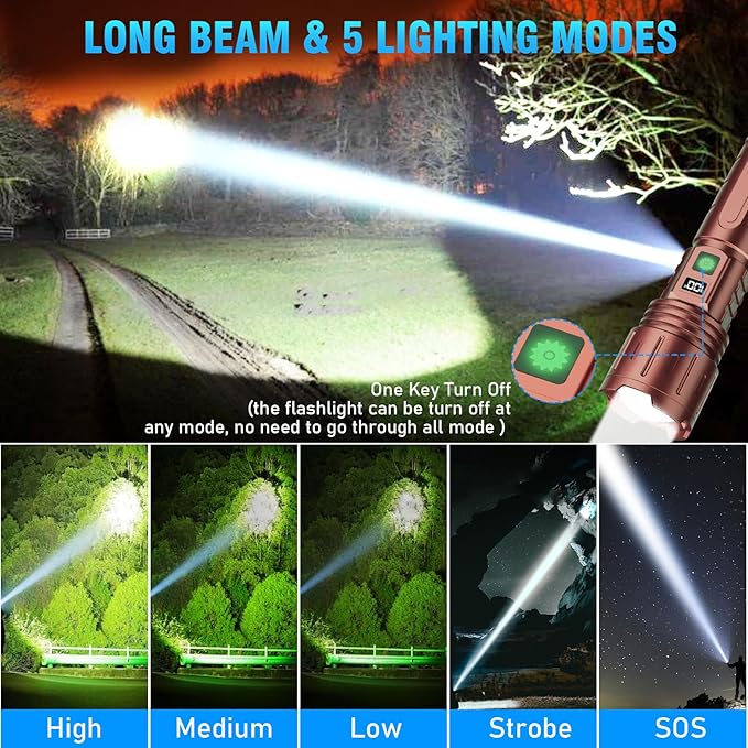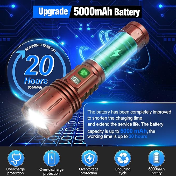 - Super Bright Long Beam Flashlight: Try our Hoxida rechargeable 20000 high lumen flashlight, with an optical-grade double-convex lens that produces a perfectly balanced beam, This Powerful LED Flashlight REAL illumination distance can be reach up to 1500ft, light is more wider and brighter than ordinary LED flashlight.easily easily lock the target and lighting up an entire room or backyard.Especially suitable for special needs such as field search, sea rescue, long-distance instructions, etc.