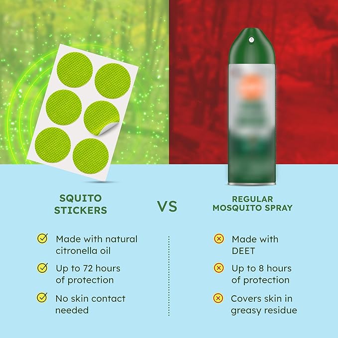 - Squito Stickers are our easy-to-use mosquito repellent patches that are essential-oil based and do not contain DEET or other harmful chemicals. It contains natural Citronella oil that effectively repels mosquitoes. Just stick to any surface such as your clothing, hats, bags, strollers, and more. Squito Stickers are perfect for pool days, camping, or any other outdoor and indoor activities.