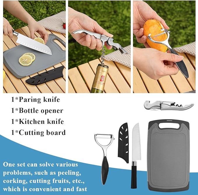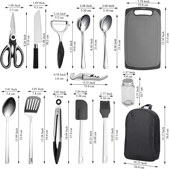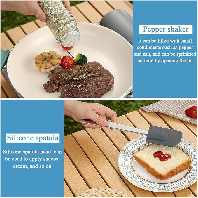 - COST-EFFECTIVE CAMPING KIT: This is a complete camping and kitchen kit, including oil brush*1, oil scraper*1, leaky spatula*1, tongue spoon*1, food tongs*1, kitchen scissors*1, chef's knife*1, chopping board*1, spice bottle*2, paring knife*1, bottle opener*1, communal spoon*1 and communal leaky spoon*1, which can be a good companion for your cooking.