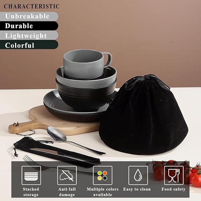 - Camping utensils set includes: 2 dinner knife, 2 dinner fork, 2 dinner spoon, 2 plastics cups, 2 plastics plates and 2 plastics bowls.