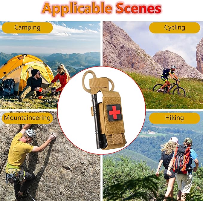 - 【Universal TQ Tourniquet Pouch】Our MOLLE first aid kit is made from high quality material, reliable and wear-resistant, it can store the medical tourniquet, scissor, penlight and marking pen perfectly. The tourniquet bag's sturdy straps make it easy to carry and attach to backpacks, tactical vests, belts, or other MOLLE compatible gear, making it a great choice for your hiking adventures.