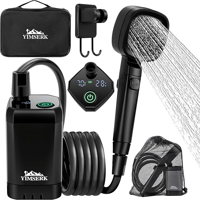 - 7800mAh High-Capacity Outdoor Battery - The upgraded 7800mAh camping shower pump is designed for family use, capable of continuous operation for 160-190 minutes. It has a maximum water flow rate of 2 gallons per minute (8 liters per minute). The portable camping shower USB-C interface can be charged using a phone charger, power bank, laptop, or car USB output. Equipped with a waterproof cap for safe and reliable performance under various outdoor conditions.