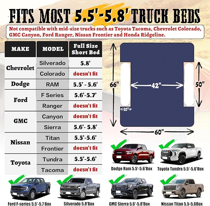 - FULL SIZE Truck Bed Mattress: This air mattress is only suitable for 5.5-5.8' FULL SIZE pickup truck short beds. It is NOT for mid-size or long truck beds. Please make sure that your truck is a full-size truck before buying.