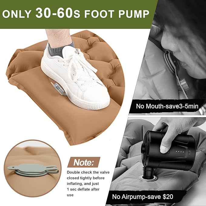 - 【Only 30s Stomp to Inflate & 1s Deflate】 Bid farewell to hand-pumping hassles. NO MORE inflating by your mouth, hands or carry a pump, just simply stomp on intake device at the bottom of the camping sleeping pad for only 30 seconds to inflate.The leak-proof membrane guarantees worry-free usage, while quick deflation adds to the convenience of your outdoor sleep preparation.