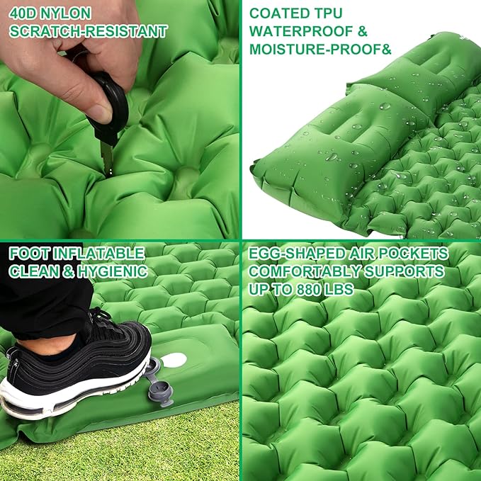 - 【Foot Press to Inflate-Only 1 min Needed】 There is no need to inflate with your hands, mouth, or a pump for our camping sleeping pad. It just only takes 1min after you inflate the sleeping mat fully by stamping the spot of the built-in pump with your foot.With anti-leakage films in the valves, you would never worry about air leaking when using it! Besides, super quick to deflate - take out the deflation plug.It's time to plan a camping and hiking with our innovative camping sleeping pad now!