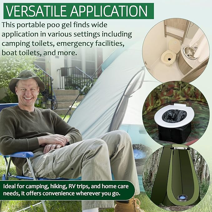 - VERSATILE APPLICATION - This portable poo gel finds wide application in various settings including camping toilets, emergency facilities, boat toilets, and more. Ideal for camping, hiking, RV trips, and home care needs, it offers convenience wherever you go.