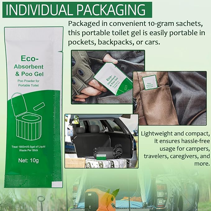 - INDIVIDUAL PACKAGING - Packaged in convenient 10-gram sachets, this portable toilet gel is easily portable in pockets, backpacks, or cars. Lightweight and compact, it ensures hassle-free usage for campers, travelers, caregivers, and more.