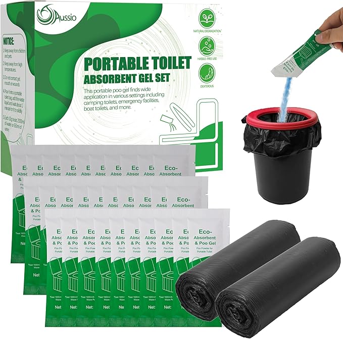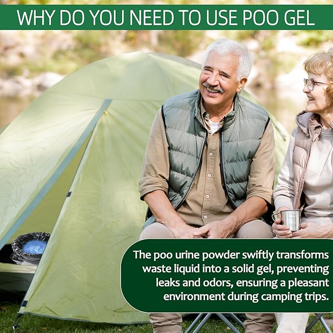 - PORTABLE POO GEL FOR OUTDOOR USE - Crafted from premium gel, this camping toilet gel efficiently absorbs and retains large amounts of liquid waste. The treated waste degrades naturally within 7 days, enriching the soil and catering to environmentally conscious travelers.