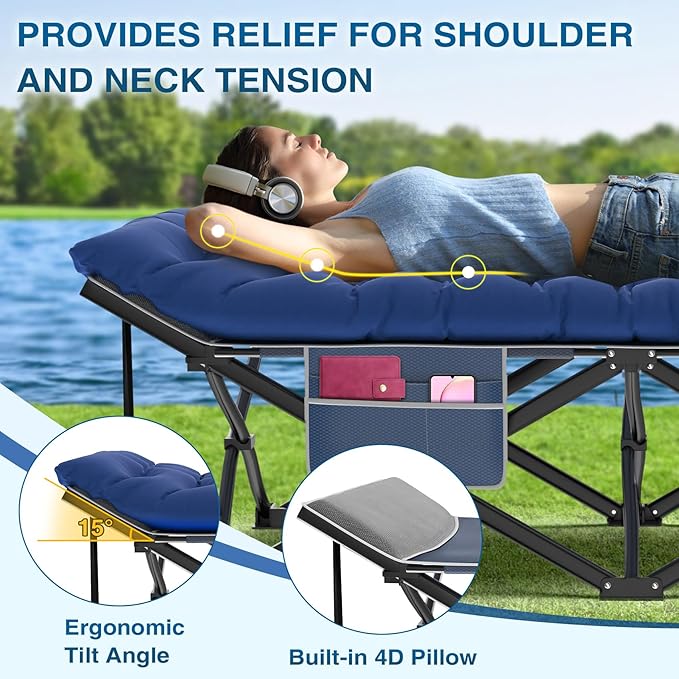 - 【Ergonomic Relief】Our camping cot, featuring a 15° head tilt and built-in pillow, provides the perfect angle to relieve neck strain, ensuring a comfortable, pain-free sleep. It's more than a sleeping solution; it's your personal oasis of relaxation in the wilderness.