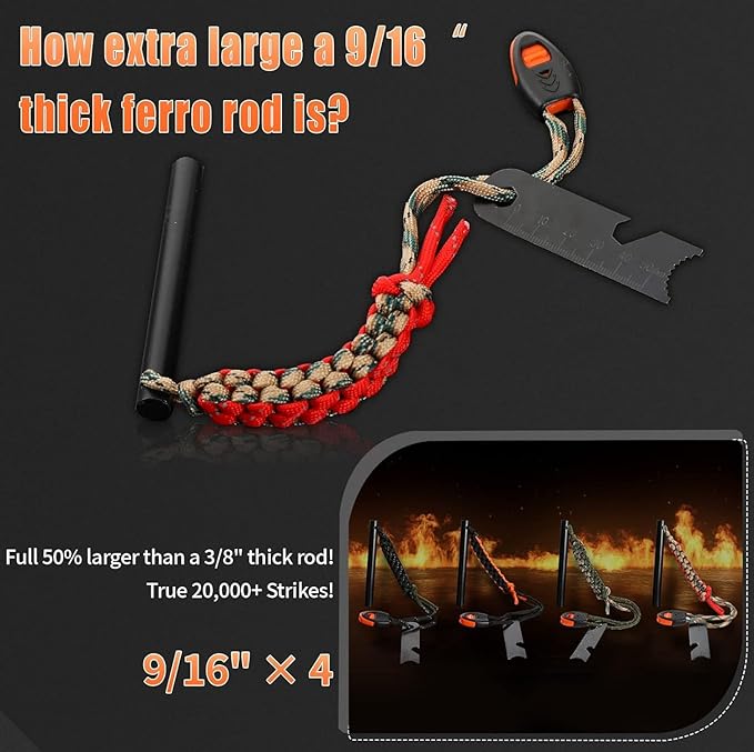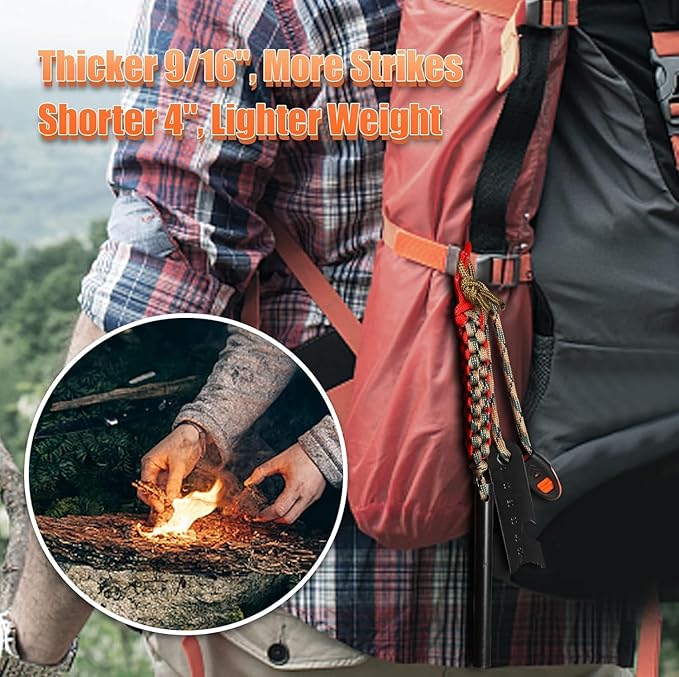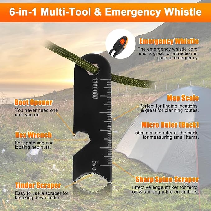 • All-in-One Survival Tool: In addition to its main ignition start function, it also includes a whistle for emergency signals, a sturdy and multifunctional steel scraper that can serve as a straight-edge striker, scraper, map scale, ruler, and hex wrench.