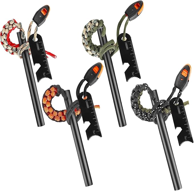 • 4-inch Ferro Rod Fire Starter: You will receive 4 sets of 3/8 inch diameter firestones with survival whistles, which can be used 20000 times, portable and durable.
