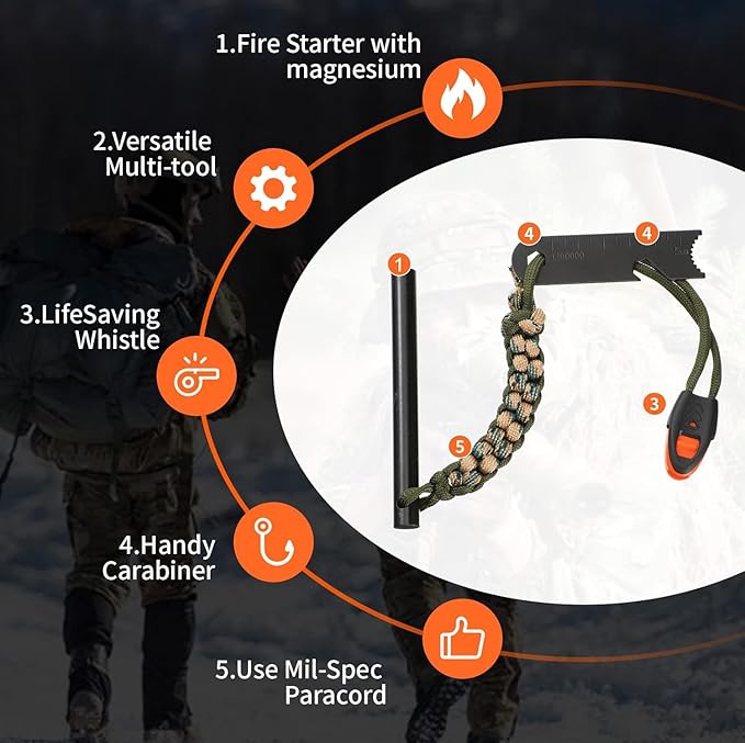 - Fire Starter Survival Tool: The flint can generate sparks and ignite flames in any humid environment. It is the perfect fire starter survival tool for camping, hiking, hunting, barbecue, or other wilderness survival.