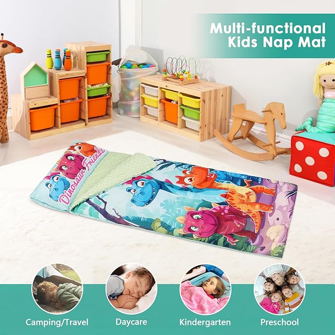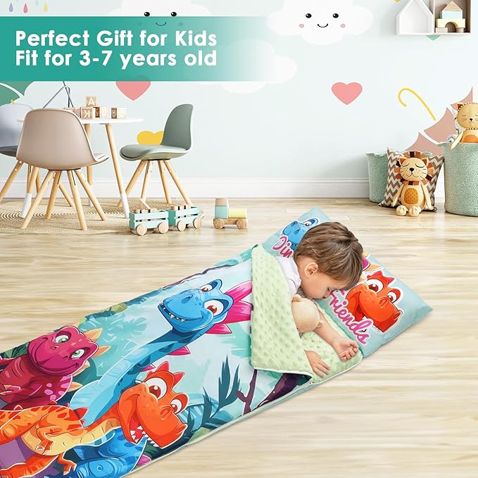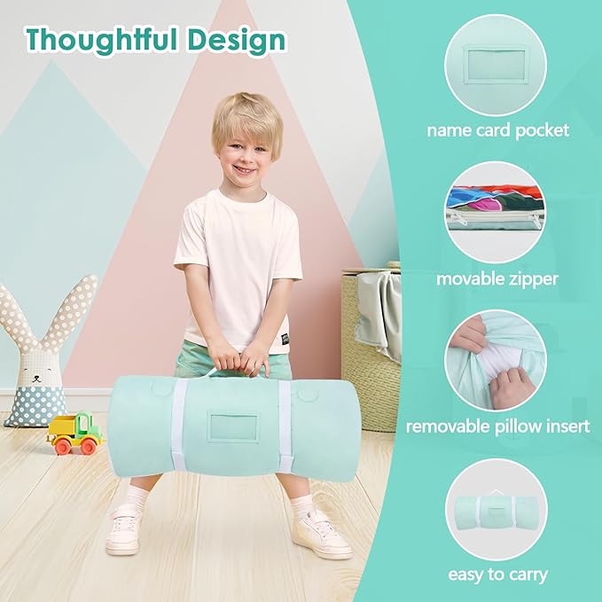 Kids Sleeping Bag Toddler Nap Mat with Removable Pillow, Large Foldable Sleeping Bag for Girls Boys, Easy Clean Slumber Bag with Double Zip for Camping School Preschool Daycare, 59×24 inch