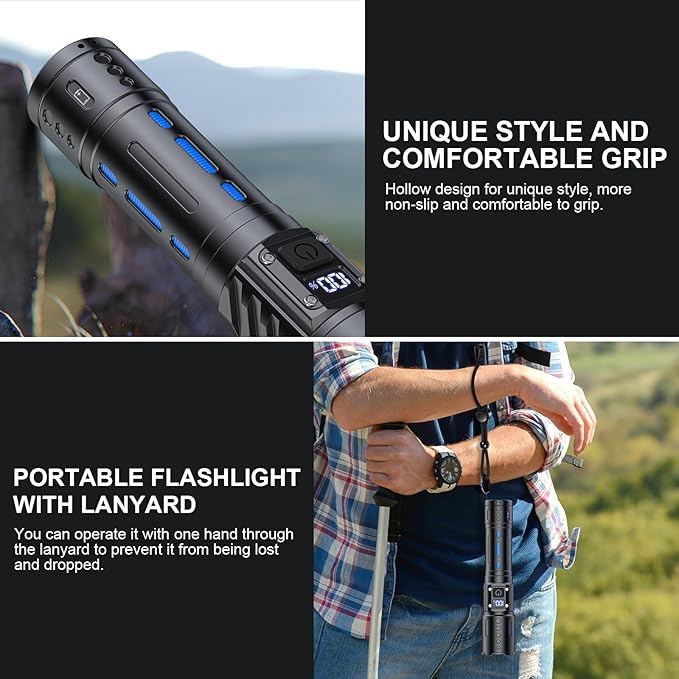 - 【TACTICAL FLASHLIGHT & POWER BANK】Super bright led tactical flashlight shell is made of aircraft-grade aluminum alloy with excellent hardness, wear resistance, drop resistance water-resistant and an anti-slip finish. Rechargeable flashlight can be used as an emergency power bank to charge your phone and other devices.