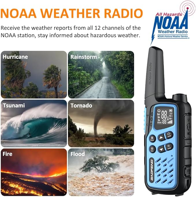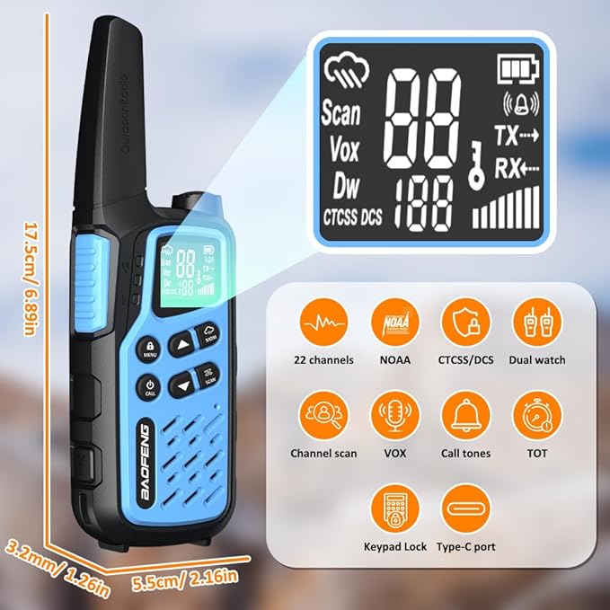 - [Walkie Talkie for Audlts] This radio features an integrated antenna and a transmission power of up to 2W, ensuring efficient transmission within legal limits. With 22 FRS channels, 50 CTCSS codes, and 105 DCS codes, it provides clear, secure, and private communication. It also supports NOAA weather broadcasting for broad information coverage.