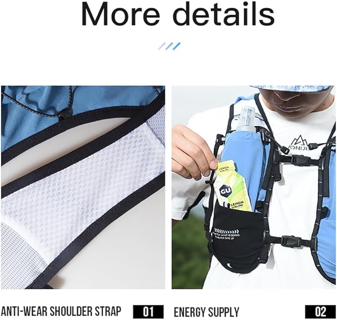 - 【Comfortable Fit Vest Pack】Fully adjustable shoulder and chest straps that guarantee the perfect fit, keeping the pack from bouncing while running. Designed with a unique padded back section to allow airflow between your back and the pack. Soft mesh on back and shoulder straps maximize breath-ability.