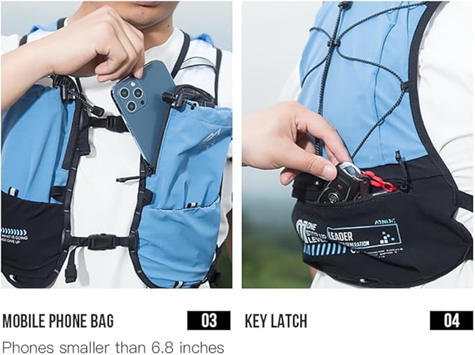 - 【Capacity】5L large-capacity main compartment for outdoor carry-on items, outside YKK zipper compartment for storing a 6.8-inch cell phone, safe and loss-proof. The kangaroo compartment on the back can store light clothing, and there is also a water bottle compartment with 500ml, allowing you to hydrate smoothly during exercise.