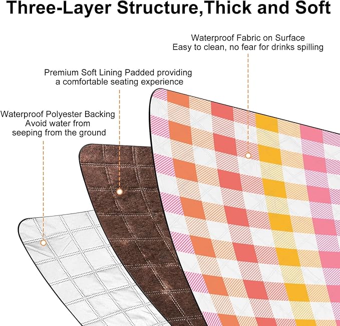 - Soft & Thick Three -Layer Structure: Our picnic blanket is crafted with a top layer of comfortable polyester fabric, a middle layer filled with plush microfiber, and a waterproof polyester film bottom, this three-layer construction, enhanced by high quality sewing technology, offers unmatched comfort and durability, ensuring that your picnic experience is as enjoyable as it is luxurious