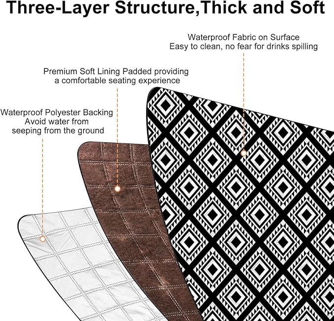 - Soft & Thick Three -Layer Structure: Our picnic blanket is crafted with a top layer of comfortable polyester fabric, a middle layer filled with plush microfiber, and a waterproof polyester film bottom, this three-layer construction, enhanced by high quality sewing technology, offers unmatched comfort and durability, ensuring that your picnic experience is as enjoyable as it is luxurious