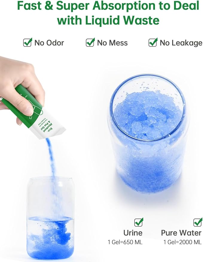 - 𝐏𝐨𝐫𝐭𝐚𝐛𝐥𝐞 & 𝐂𝐨𝐧𝐯𝐞𝐧𝐢𝐞𝐧𝐜𝐞 - With Portable Individual Package, our liquid solidifier ensures on-the-go convenience for camping toilets and beyond. Unlike bulky solidifier powder, these compact urine absorbent powder offer unmatched portability. Effortlessly slip them into your backpack for on-the-go travel such as hiking, camping, or any outdoor explore. Ideal for nature lovers seeking a clean & hassle-free outdoor waste solution.