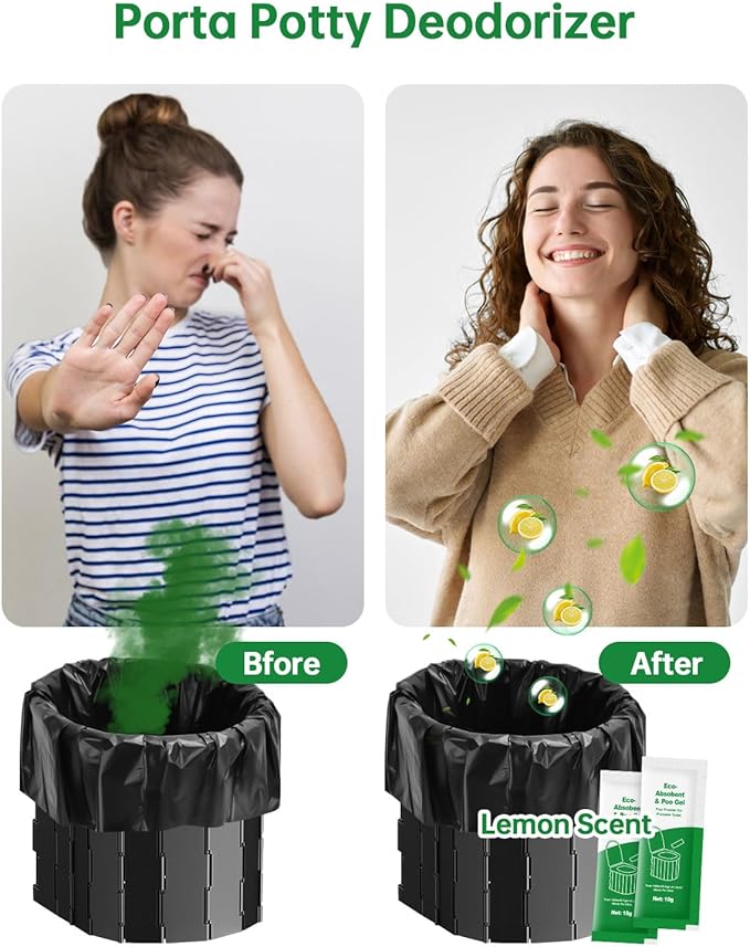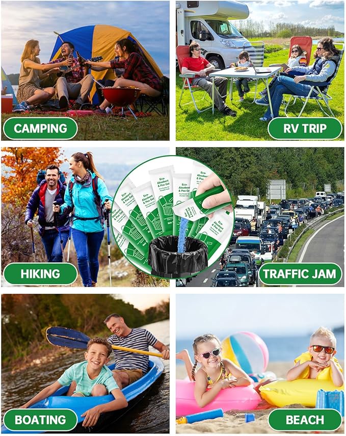 - 𝐑𝐚𝐩𝐢𝐝𝐥𝐲 𝐒𝐨𝐥𝐢𝐝𝐢𝐟𝐲 & 𝐃𝐞𝐨𝐝𝐨𝐫𝐢𝐳𝐞𝐫 - Included 80 pack(10g/pack) camping toilet poo gel. Quickly solidify pee & poo in 1-2 minutes while deodorizing odors for clean & fresh outdoor camping experience. Perfect for outdoor toilet in camping, hiking, backpacking, road trip, or emergencies. This essential camping hygiene & sanitation products ensures you tackle any outdoor human waste with ease, maintaining a tidy, pleasant environment.