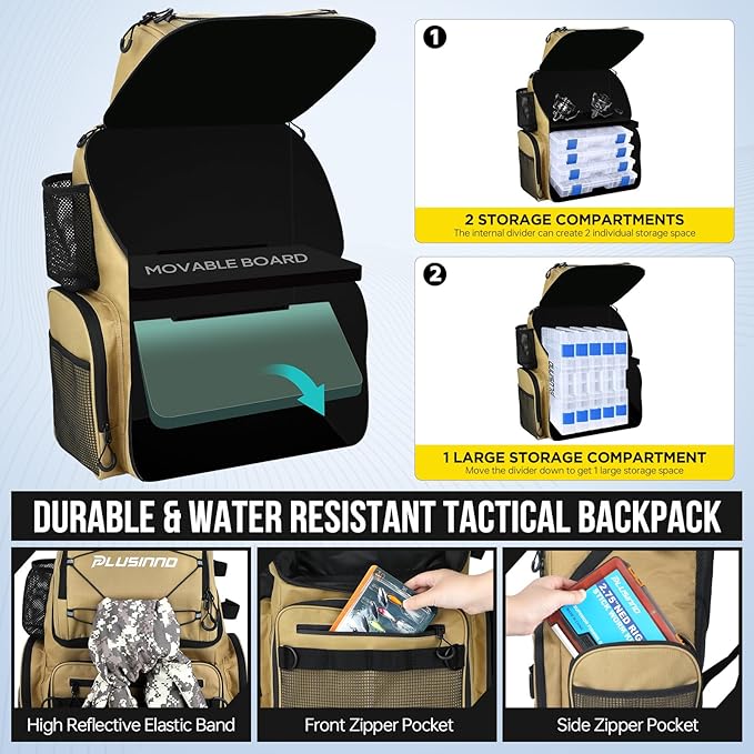 - Multifunctional Fishing Tackle Bag - PLUSINNO fishing backpack is designed with multiple pockets and storage areas tailored for different fishing gear. This fishing bag includes side pockets, a bottle pocket, numerous D-rings, and elastic cords for hanging towels or clothes... Providing convenient storage for fishing rods, bottles, keys, fishing pliers, and more. Each pocket is strategically placed for easy access, making the PLUSINNO fishing backpack an essential companion for any angler