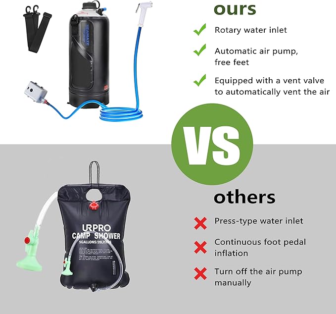 - 𝗨𝗦 𝗣𝗔𝗧𝗘𝗡𝗧 𝗗𝗘𝗦𝗜𝗚𝗡 𝗔𝘂𝘁𝗼𝗺𝗮𝘁𝗶𝗰 𝗖𝗮𝗺𝗽𝗶𝗻𝗴 𝗦𝗵𝗼𝘄𝗲𝗿 𝗣𝘂𝗺𝗽 - with this pump, it is easier than ever to inflate the water tank to get a shower ready. Auto pump frees your feet from continuous foot pedal inflation. Make outdoor bathing no longer puzzled. Please make sure you have pressed the pump button for about 2~3 seconds, then it works.