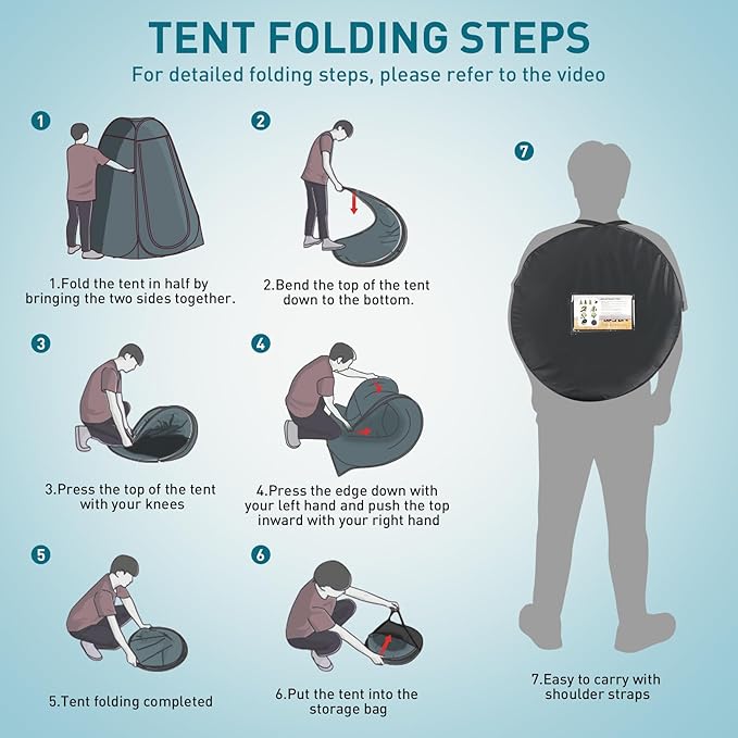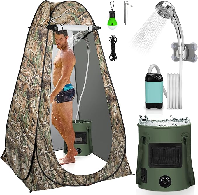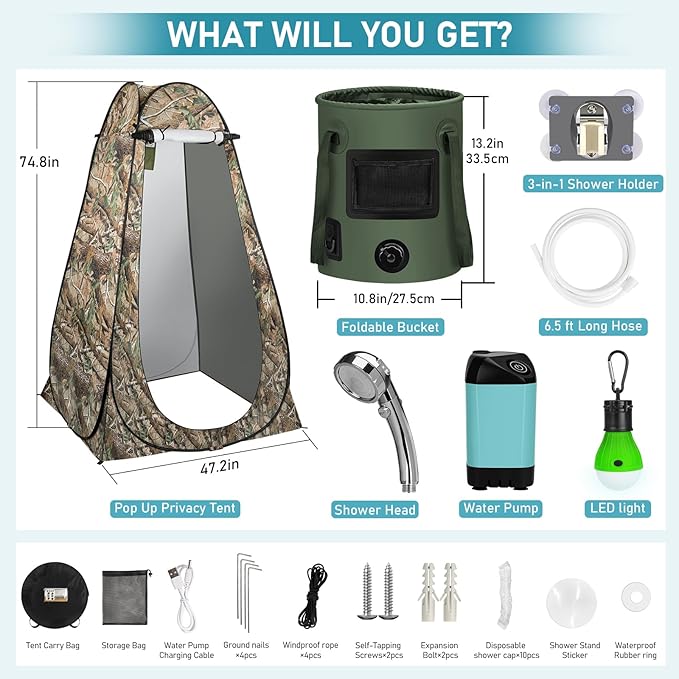- Complete Camping Shower Kit: Thallike portable shower tent kit includes 6.2ft tall privacy tent(ropes and stakes included), LED camping light (batteries not included), rechargeable camping shower pump, 6.6 Gallon collapsible bucket, 10pcs disposable shower caps, 1 shower pump mesh storage bag and 1 camping tent backpack. All in One set, convenient for outdoor shower and other emergencies.