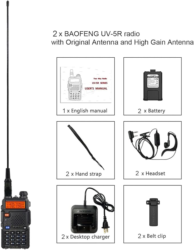 - What You Get? 2 x BAOFENG UV-5R radio with original & long antennas, 2 x 1800mAh Li-Ion battery, 2 x Headset, 2 x Desktop charger, 2 x Belt clip, 2 x Hand strap, 1 x English manual.