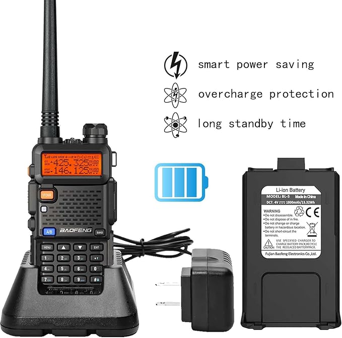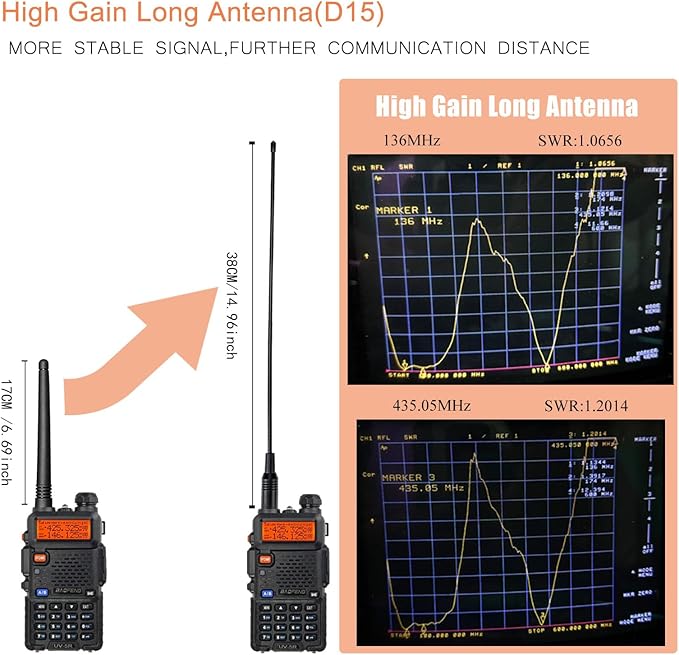 - Walkie Talkie Long Distance with 14.96inch High Gain Long Antenna, Rechargeable Battery, High/Low Power Selectable, Dual Band Dual Watch, 128 memory channels.