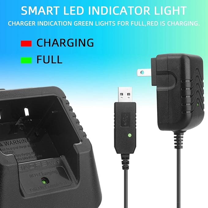 - Smart LED Indicator: The BAOFENG UV-5R desktop charger features intelligent LED indicator lights that clearly show the charging status. A red light indicates that the battery is charging, while a green light signifies that the charge is complete, making it easy to monitor.