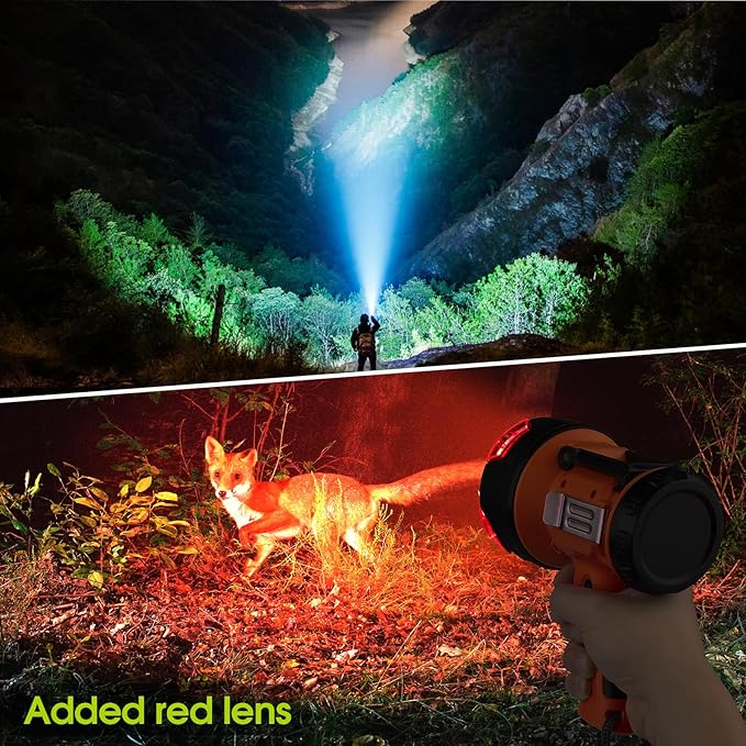- Additional Features for Ultimate Versatility: This handheld spotlight offers an adjustable stand for hands-free use and a removable red filter for hunting, making it perfect for any adventure. A durable clip lets you attach it to your belt or pants for easy access, while the large, comfortable handle enhances usability for hunting, camping, boating, and emergencies.