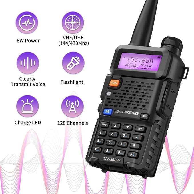 - 8Watts High Power Radio:High/ Mid/Low Power,Dual band / Dual display / Dual standby,128 channels;50 CTCSS and 104 CDCSS,AUTO Keypad Lock,LED Flashlight,FCC ID:2AJGM-UV5R