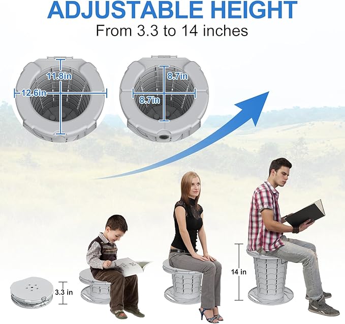 - HEIGHT ADJUSTABLE: This portable potty for adults is designed with an innovative fish-cale structure, allowing you to adjust the height from 3.3 to 14 inches in 7 steps. It's quick and easy - just pull and twist clockwise to start using instantly! After use, simply rotate counterclockwise and press it down into a disk. This small and lightweight folding toilet caters to different heights and is the best choice for camping,hiking,long trips,traffic jams,and more.