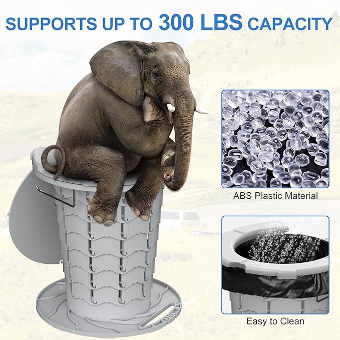 - STURDY & DURABLE MATERIAL: The side panels of porta potty travel toilet is made of modified ABS plastic material with 70 latches and non-slip bases for stability. Its extremely portable design makes it the best camping potty, offering home comfort in a compact, washable, and sturdy form that can support up to 300 LBS. Our travel potty for adults comes with a waterproof handy bag for easy storage and transport and comes with two roll toilet bags.