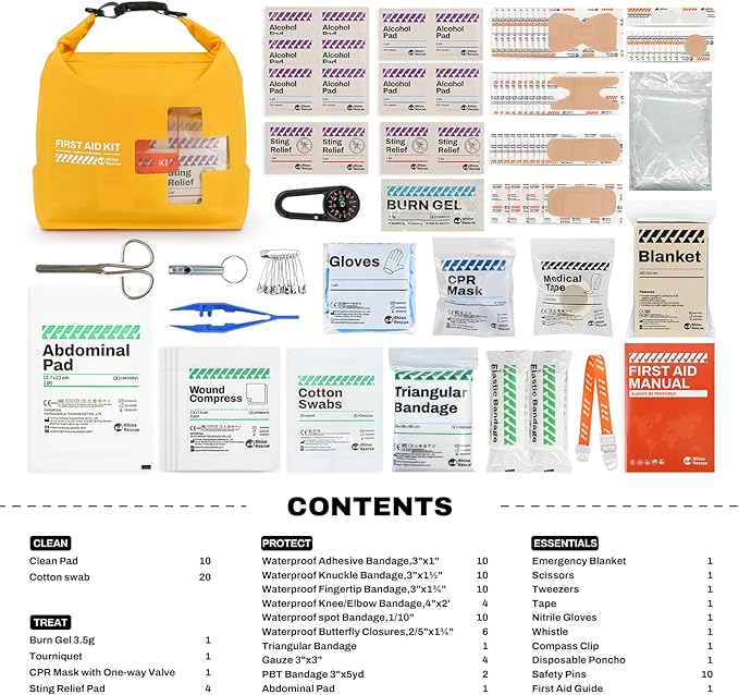 - Lightweight & Portable: The entire kit weighs only 0.9 pounds. Compact and easy to carry, this kit can be hung on your backpack, making it ideal for hiking, water sports, and camping, and providing you with outdoor safety support.