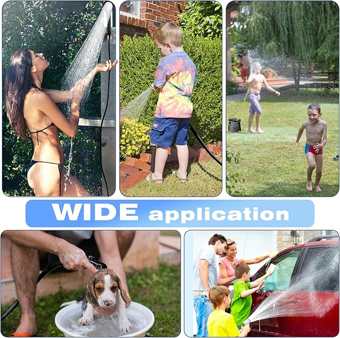 - 🛀[PORTABLE OUTDOOR SHOWER SOLUTION] The Portable Camping Shower Set Is Lightweight and Compact, We Provide A Storage Bag For Easy Transport. Easy to Set Up. Suitable For Rv Travel, Family Camping, Personal Adventure, Indoor, Outdoor Bathing, Backpacking, Barbecue, Hiking, Beach, It Can Be Used to Bathe The Baby, Clean The Pets, Water The Plants.