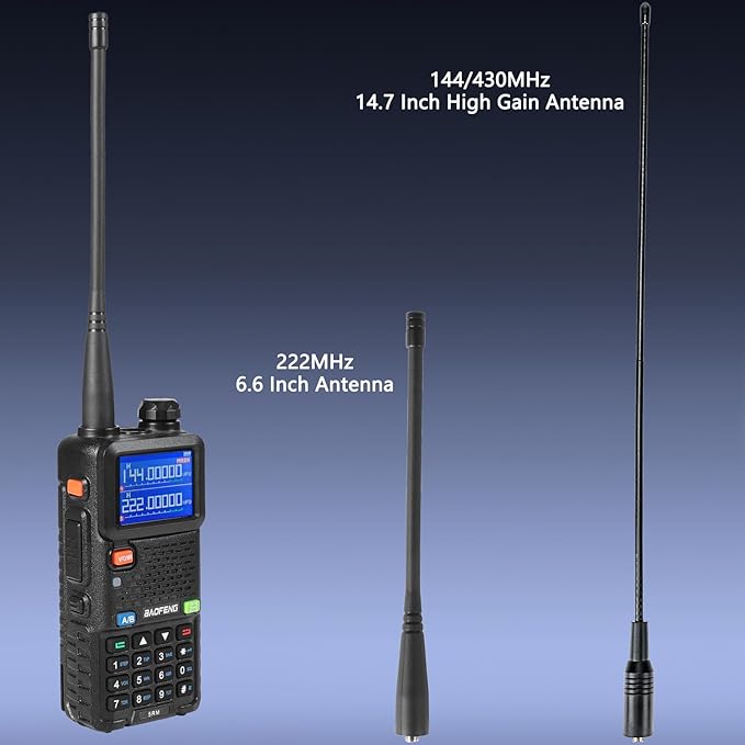 - Included Components : Baofeng ham radio with antenna x 1, 14.7 inch high gain 144/430MHz antenna x 1, 6.6 inch 222MHz antenna x 1, 31.5 inch type-c cable x 1, Rechargeable 2500mAh battery x 2, Earpiece x 1, Desktop charger x 1, Belt clip x 1, Hand strap x 1, User's manual x 1. Baofeng ham radio with antenna x 1, 14.7 inch high gain 144/430MHz antenna x 1, 6.6 inch 222MHz antenna x 1, 31.5 inch type-c cable x 1, Rechargeable 2500mAh battery x 2, Earpiece x 1, Desktop charger x 1, Belt clip x 1, Hand st… See more