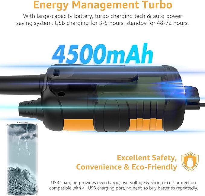 - 【Energy Management Turbo】:Experience the brilliance of a large-capacity battery with turbo charging tech. The 4500mAh rechargeable battery has high safety and long life, no more frequent charges or buying batteries, save the environment and your wallet. Enjoy the convenience of USB fast charging cable with 48-72 hours of standby on a mere 3-5 hour charge, USB compatibility ensures you can charge anywhere, anytime, such as charged by car, laptop or power bank, etc