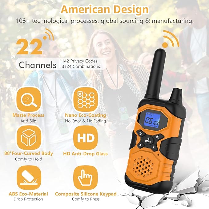 - 【Proudly American Tech & Design】:Advanced walkie-talkies are trusted by millions of people worldwide. Our global sourcing and manufacturing culminate in a product that stands testament to American ingenuity and quality. Experience our walkie talkies' world-class design & functionality, such as Smart control system(Auto squelch,Auto memory,Auto scanning,Auto power saving,Low battery alert), iVOX hands-free, Drop-protection, 22 channels(142 privacy codes), Compatible with FRS devices, NOAA Service