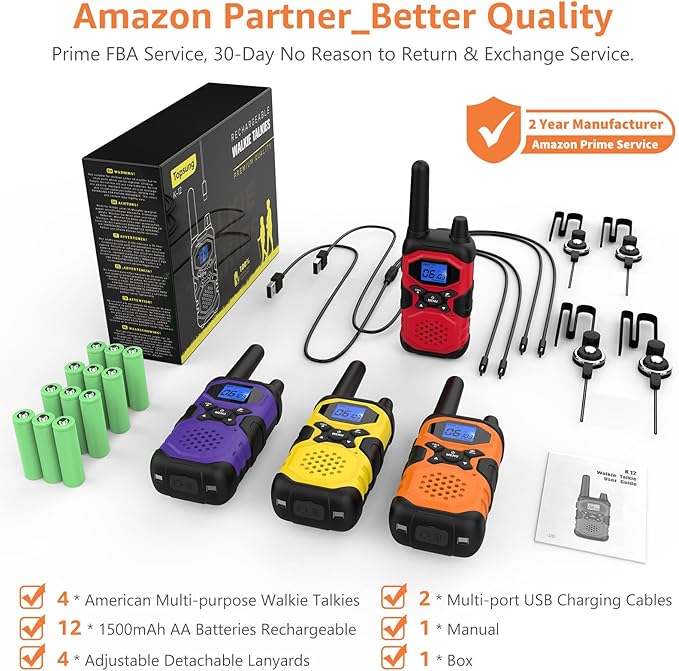 - Included Components : 4 * Detachable Lanyards & Belt Clips, 2 * Multi-port USB Charging Cables, 1 * Manual & 2 Year Manufacturer, 4 * American Multi-purpose Walkie Talkies, 4 * 4500mAh AA Batteries Rechargeable 4 * Detachable Lanyards & Belt Clips, 2 * Multi-port USB Charging Cables, 1 * Manual & 2 Year Manufacturer, 4 * American Multi-purpose Walkie Talkies, 4 * 4500mAh AA Batteries Rechargeable