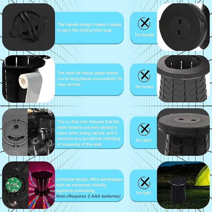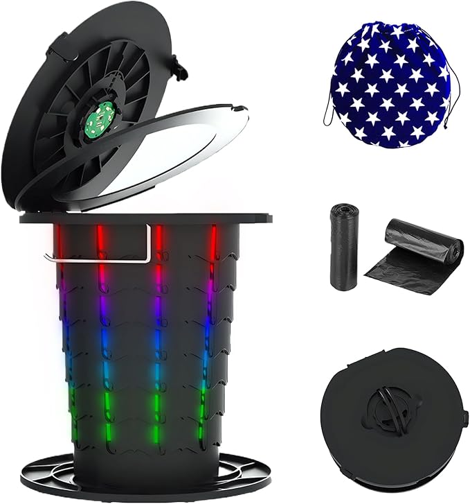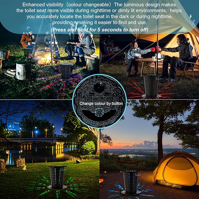 - New Upgraded Foldable Toilet: Glow-in-the-dark feature on the foldable portable potty provides additional illumination, increases safety during use,reduces the risk of tripping or falling at night or in dimly lit environments. This is especially important for older people, children or other users who need extra attention for safety.The four colours of light can create different atmospheres for outdoor activities such as picnics or camping. You can choose the right colour according to your preference or the needs of the occasion.