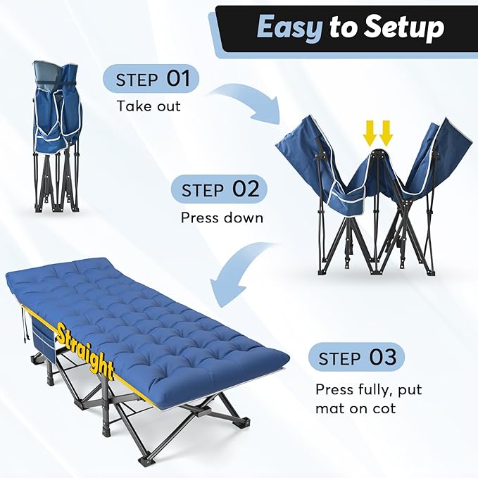 - Portable & Folding--Camping cots offer the convenience of easy portability, allowing you to set up a comfortable sleeping space anywhere you go, lightweight(23.3 lbs), foldable, come with Oxford bag for hassle-free transportation. Say goodbye to uncomfortable sleeping arrangements on the ground.