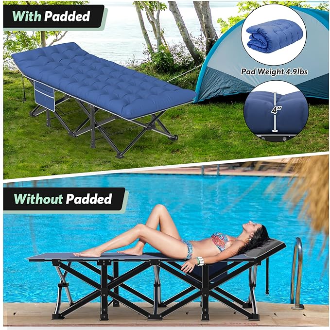 Slendor Oversized XXL Camping Cot, Folding Cot for Adults, 79" L x 32" W x 19" H Sleeping Cot with Mattress, Carry Bag, Camp Cot Bed for Travel, Guest, Support 500lbs, Blue Cot+ Blue Pad